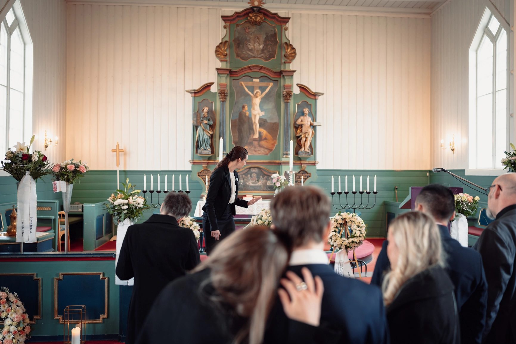 DIALOG: Gunnhild Landsem i dialog med pårørende og familiemedlemmer i forbindelse med en begravelse i Egge kirke.